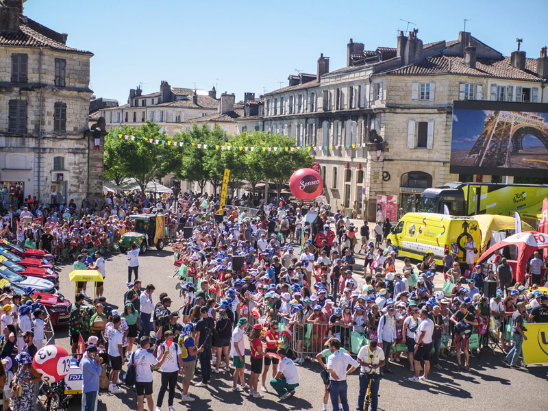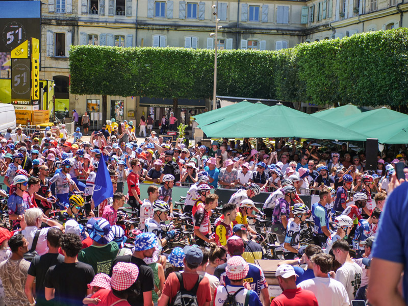 À partir de 11 heures, le parvis devient le théâtre de la présentation officielle des équipes. Un moment fort, empreint d’émotion, marqué par l’hommage rendu au jeune cycliste tragiquement décédé lors de l’étape de la veille. Mais avant cette cérémonie solennelle, place à la fête avec la caravane publicitaire, attendue comme toujours avec impatience pour son flot de musique, de bonne humeur et de goodies lancés à la volée.