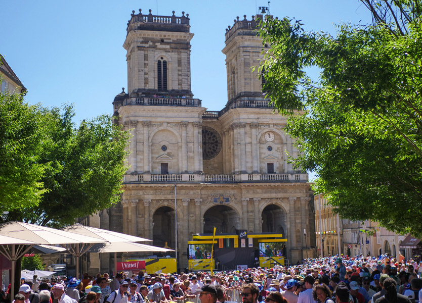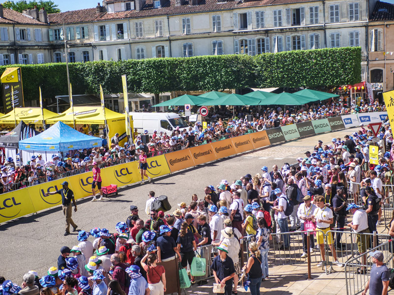 Ce mercredi 17 juillet, dès les premières lueurs du jour, la ville d’Auch s’est éveillée au rythme du Tour de France. Il est 6h30 à peine que les premiers préparatifs battent leur plein : installation des stands, montage du village du Tour, fermeture des routes à la circulation… Le cœur de la ville se transforme progressivement en véritable temple du cyclisme.