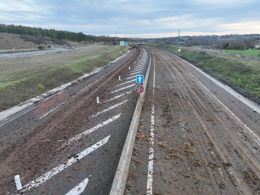 Parallèlement, une équipe d’agents des routes intervient sur le tronçon de la RD 1124 entre Auch et Aubiet afin d’évacuer plus de 200 mètres de lisier et de dégager les déchets (paille, pneus et autres détritus). Après réparation de la chaussée, une voie de circulation sera rétablie dans un premier temps dans les deux sens.