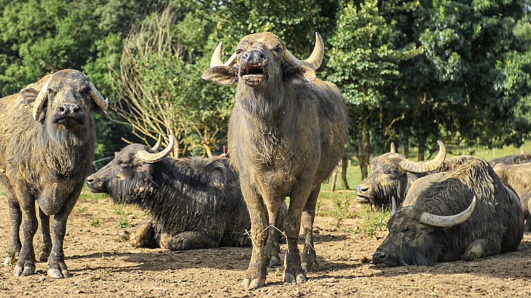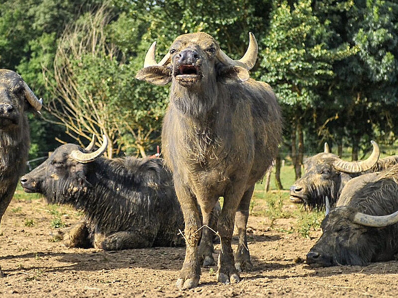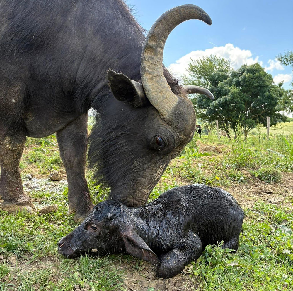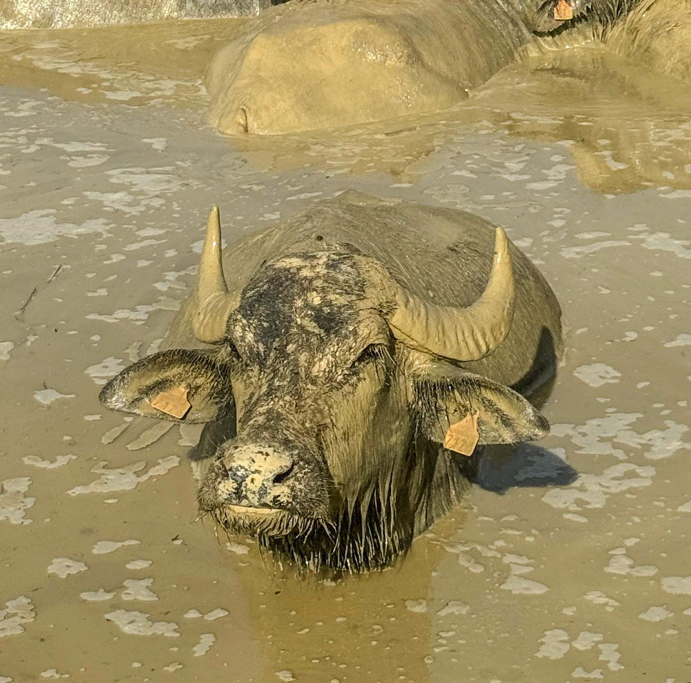 Un regard que l’on retrouve aujourd’hui dans les yeux de Lucile lorsqu’elle rejoint Zia, Gina, Olbia, Lola et les autres, dans les 30 hectares de pâturages qui leur sont dédiés. Majestueuses, avec leurs cornes recourbées et leur gabarit imposant, ces grandes dames n’en sont pas moins de paisibles compagnes. « Elles passent leurs journées à se baigner, à s’enduire de boue, à sécher, à manger, et à se re-baigner… Elles sont très curieuses et attachantes », explique Lucile, qui avoue sans détour avoir eu un véritable coup de coeur pour cet animal hors norme.