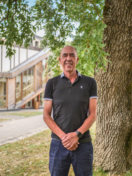 « Je suis passé par plusieurs autres établissements avant Samatan, où je suis maintenant depuis 14 ans. Mon quotidien ? À 6h30, j’attaque par les espaces sportifs : le gymnase, le dojo, les vestiaires à rendre impeccables. Comme je suis très manuel, j’aide aussi mes collègues à la maintenance: peinture, électricité, maçonnerie … et surtout, les espaces verts, ce que je préfère. Ce qui me rend fier, c’est notre projet commun avec les enseignants et les élèves autour des arbres et paysages du Gers. Je suis très impliqué dans la plantation d’arbustes, de fleurs… pour embellir le collège. Ce métier, ce n’est jamais la routine : on répare, on crée, on rend le cadre agréable… et ça, c’est du concret! »